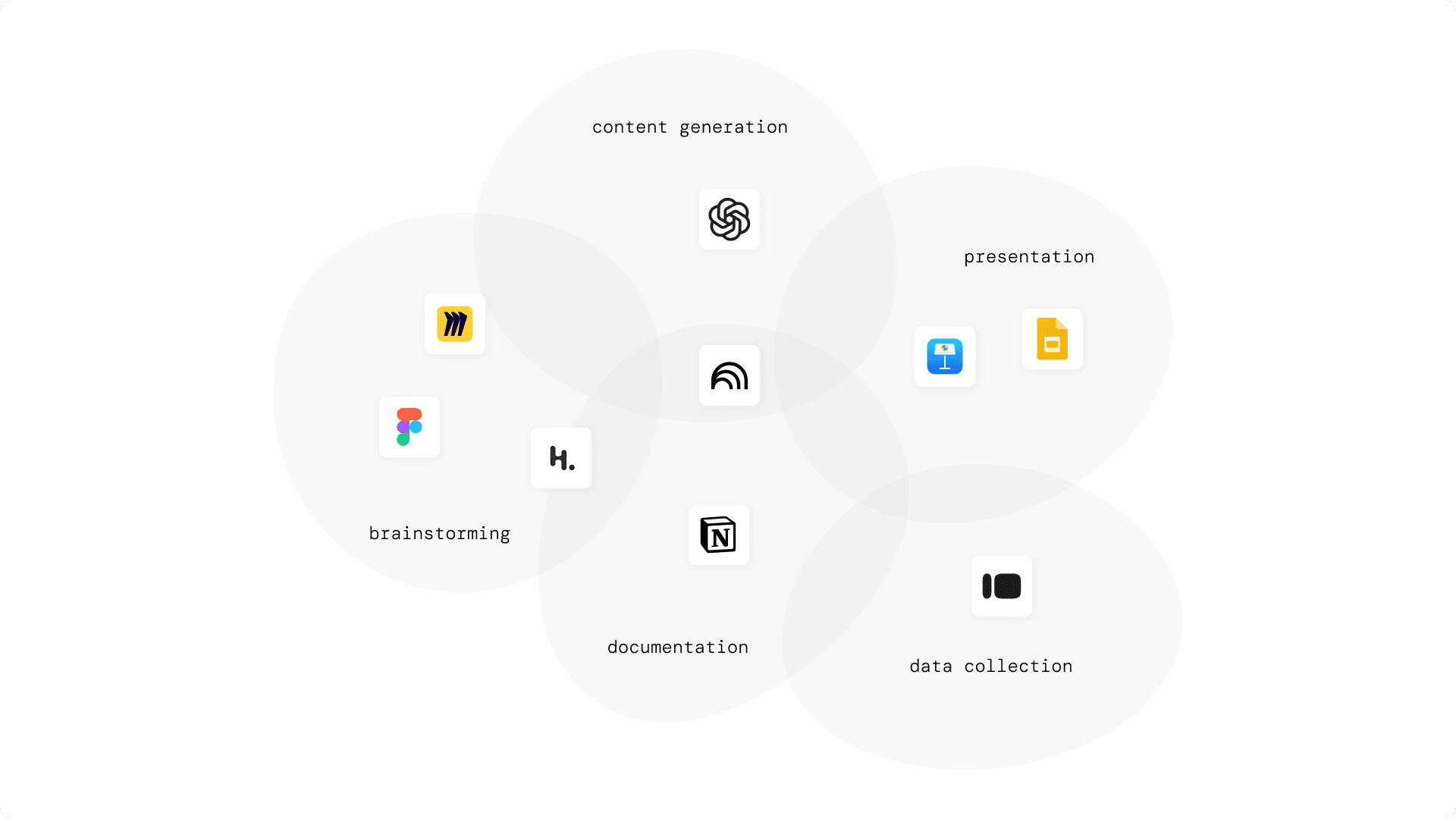 We take structured notes in Notion, brainstorm in FigJam or Miro, ask ChatGPT for ideas, collect data in Typeform, and finally build presentations in Slides.