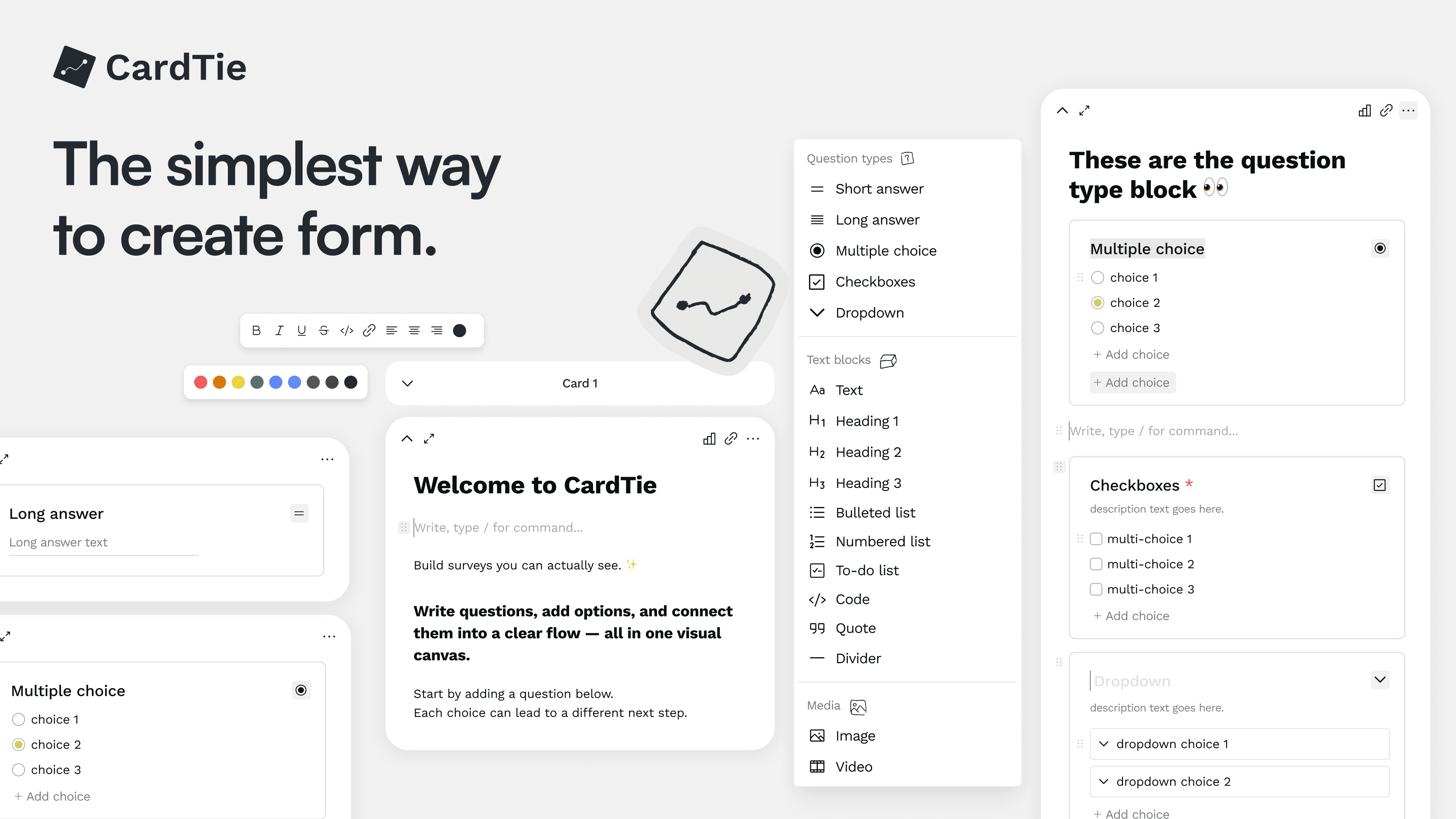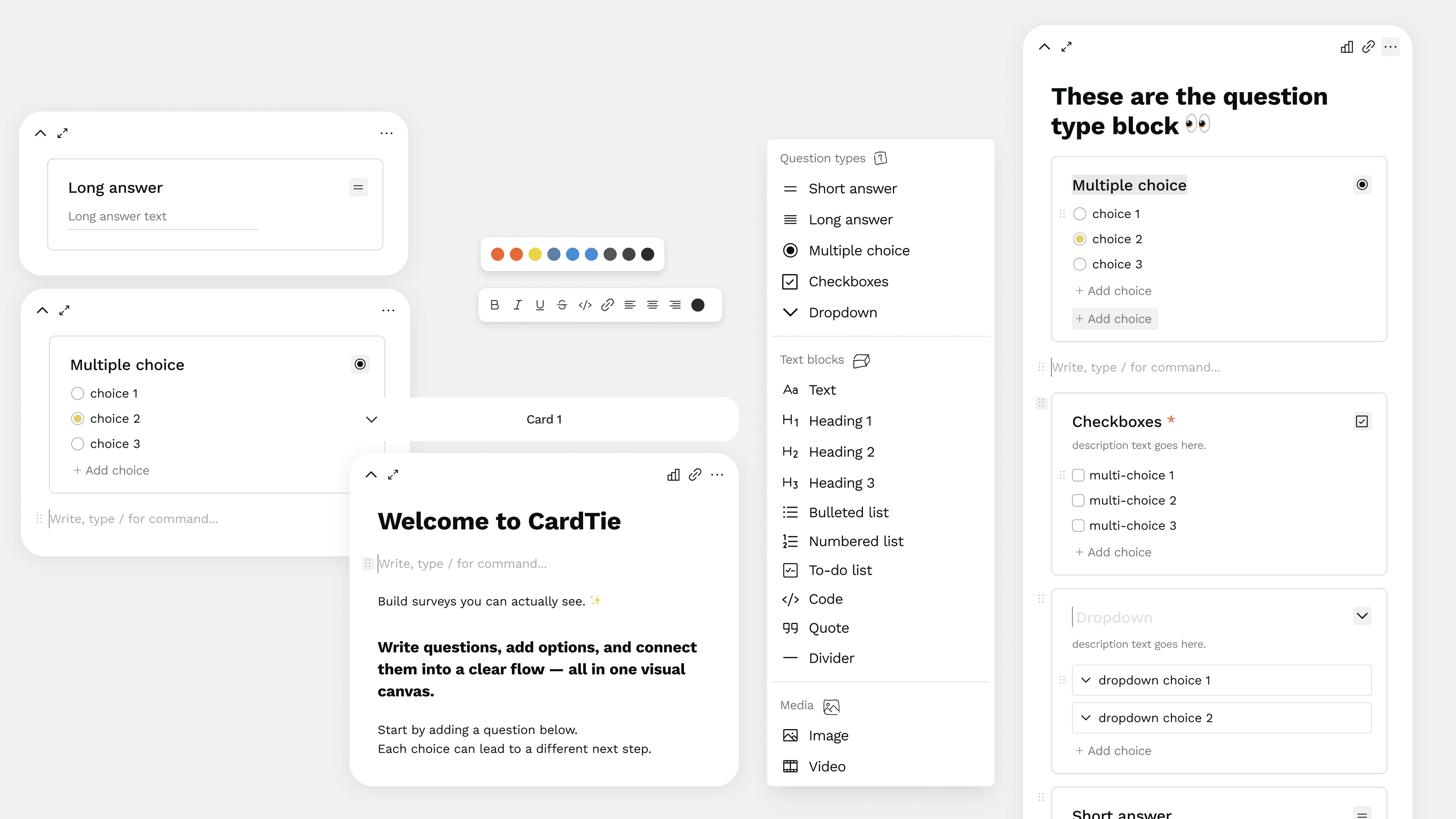 Cards are the atomic unit of CardTie. Every question, every content block, every media element lives inside a card. Each card can contain multiple block types — a question title, a description, a multiple choice block, an image — and cards connect to each other through lines.