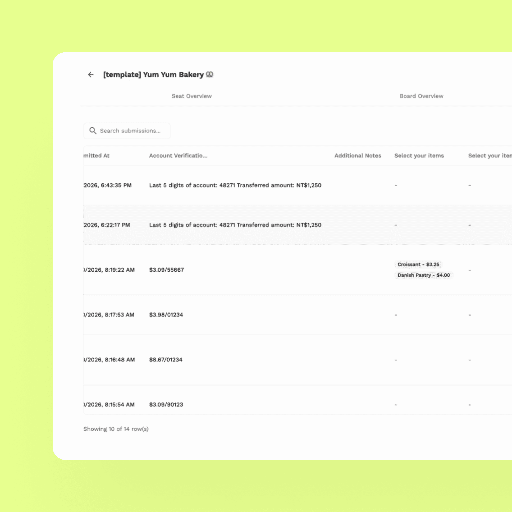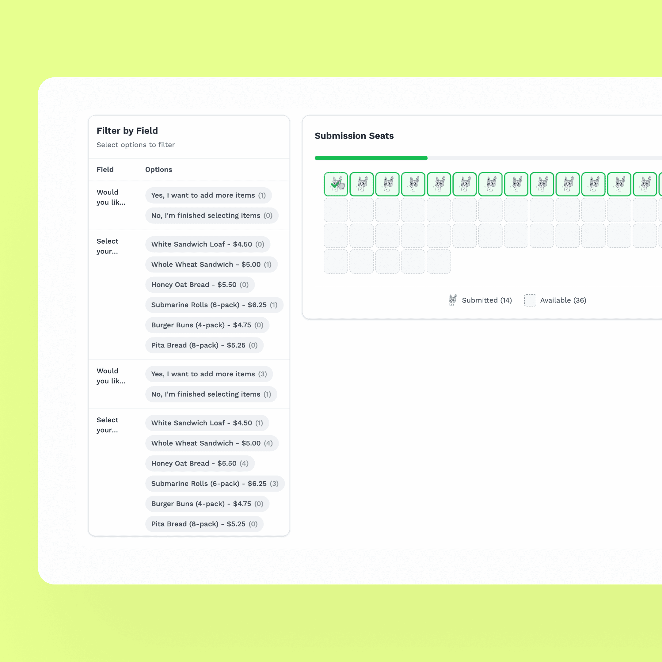 The Seat Overview takes a different angle: a grid of dog mascot icons (one per submission), filterable by field value. Click any submission to see the full response detail. The result is an analytics dashboard with personality — one that feels like it belongs to the same product as the editor.