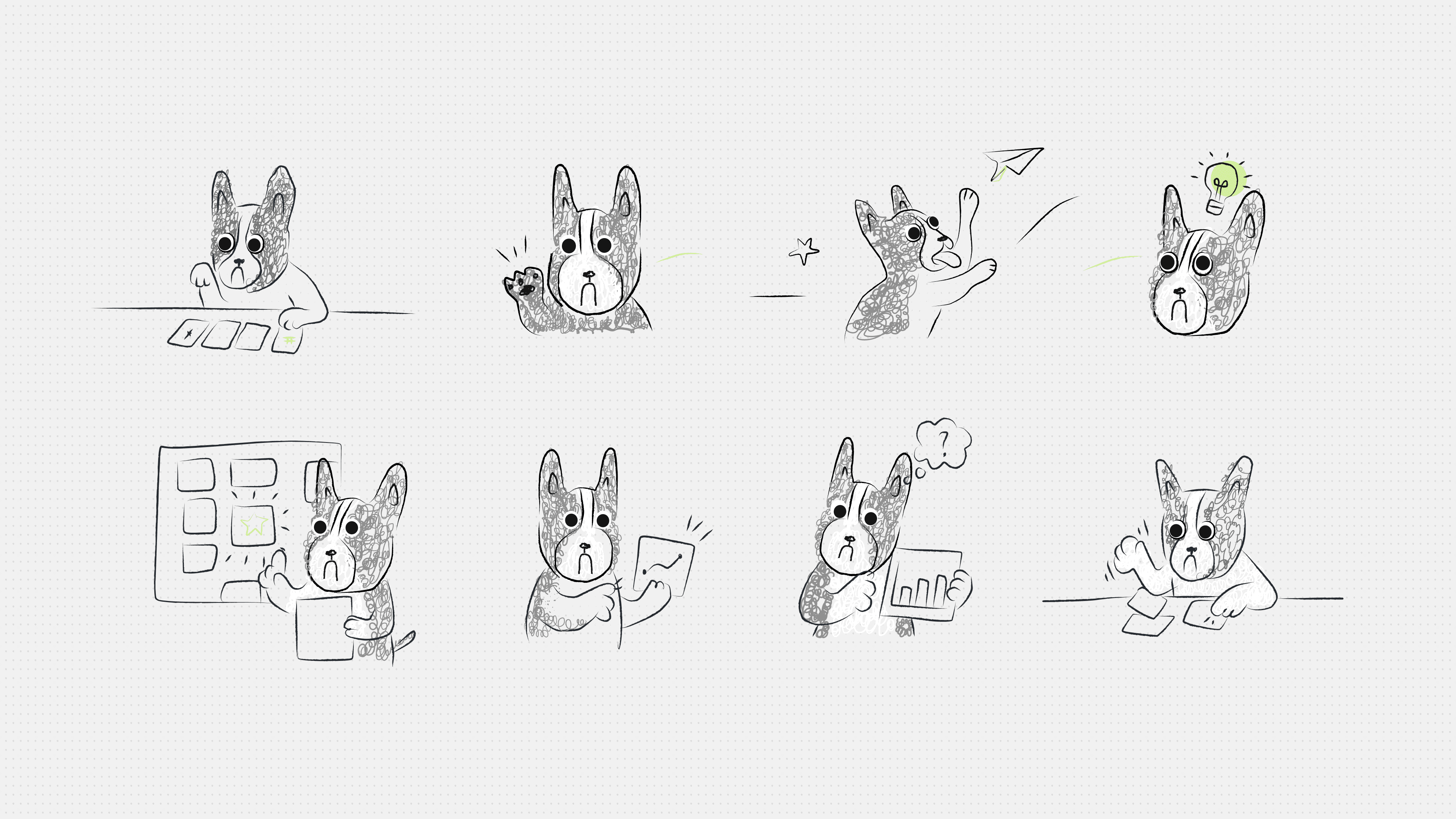 The final brand merged both directions. We kept the green-yellow palette and clear typographic hierarchy from Direction B, but brought in hand-drawn illustration elements, doodle accents, and — crucially — replaced the cat with a French Bulldog mascot that became the product's personality anchor.