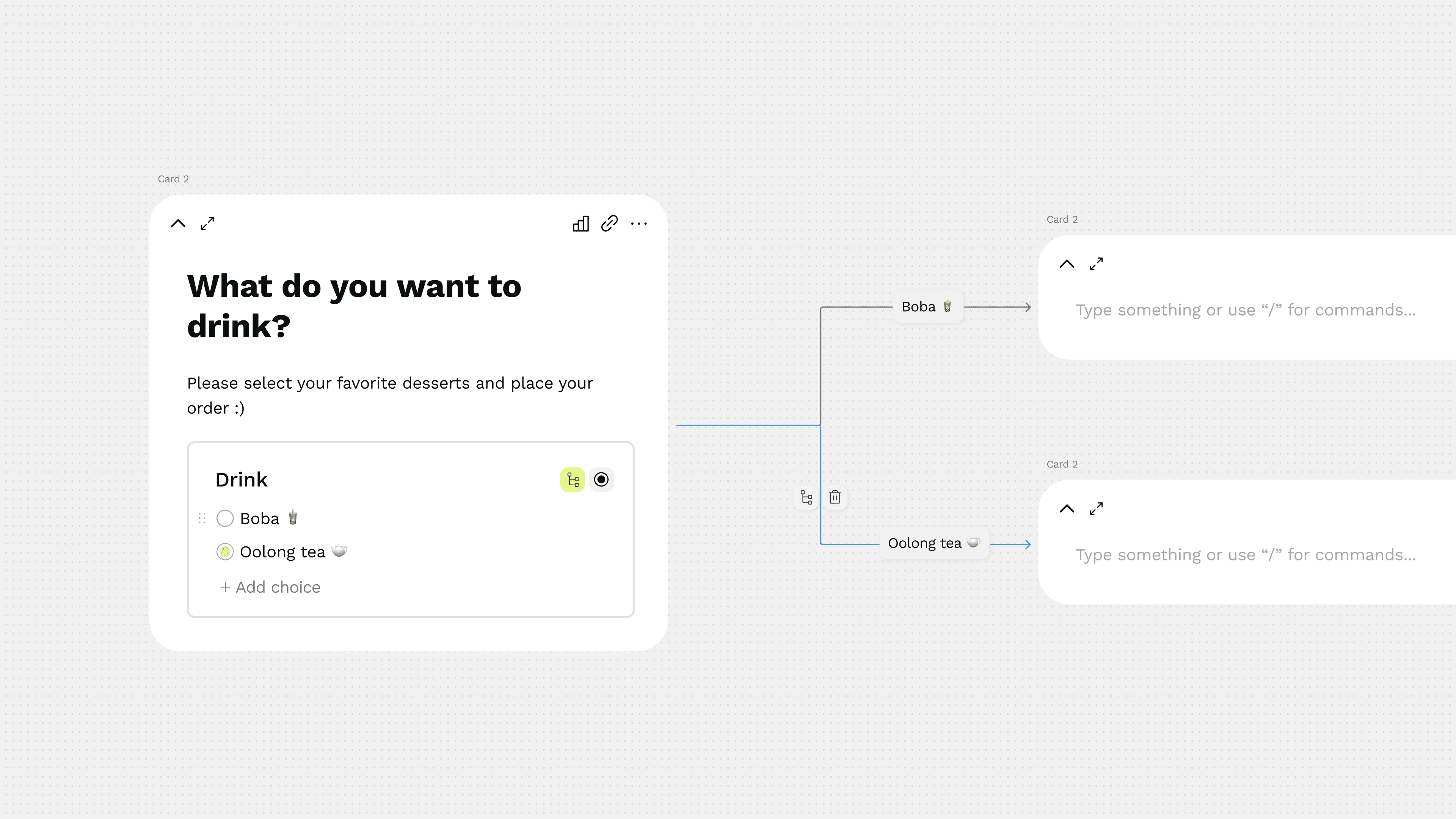 In CardTie, you draw a line. Select a choice, click "Add branching," and a line appears connecting that choice to the next card in the flow. The form becomes a diagram you can see, zoom into, and rearrange on the canvas.