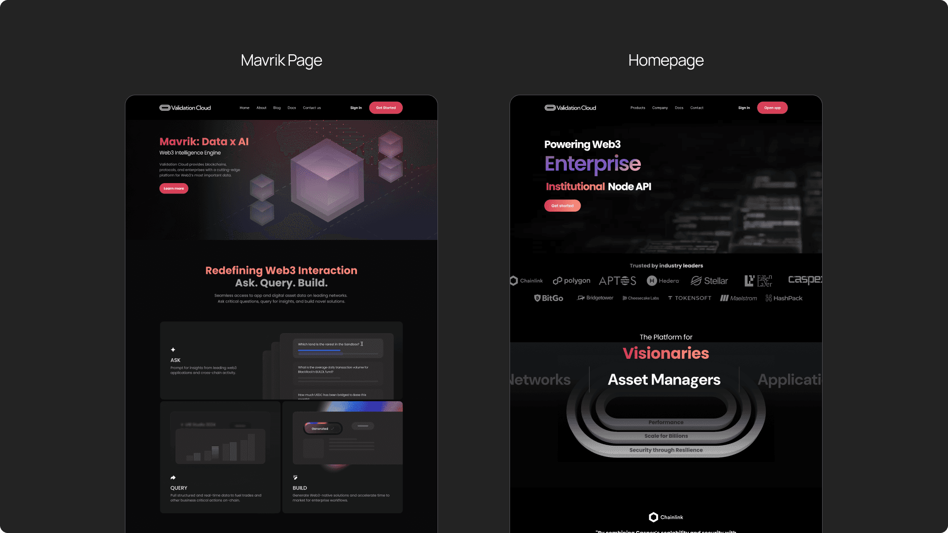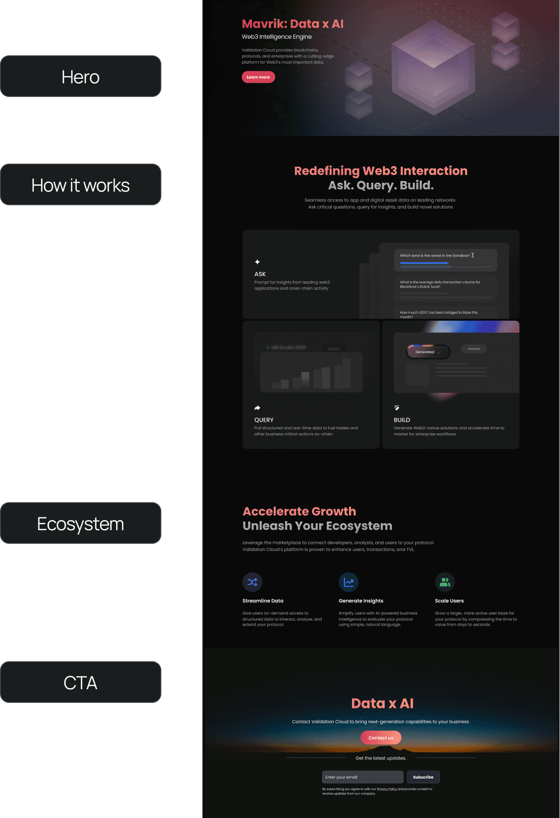 So we rebuilt the flow around a new narrative that tells a clearer story. This new structure helps users quickly understand what Mavrik does, why it matters, and why they should trust Validation Cloud.