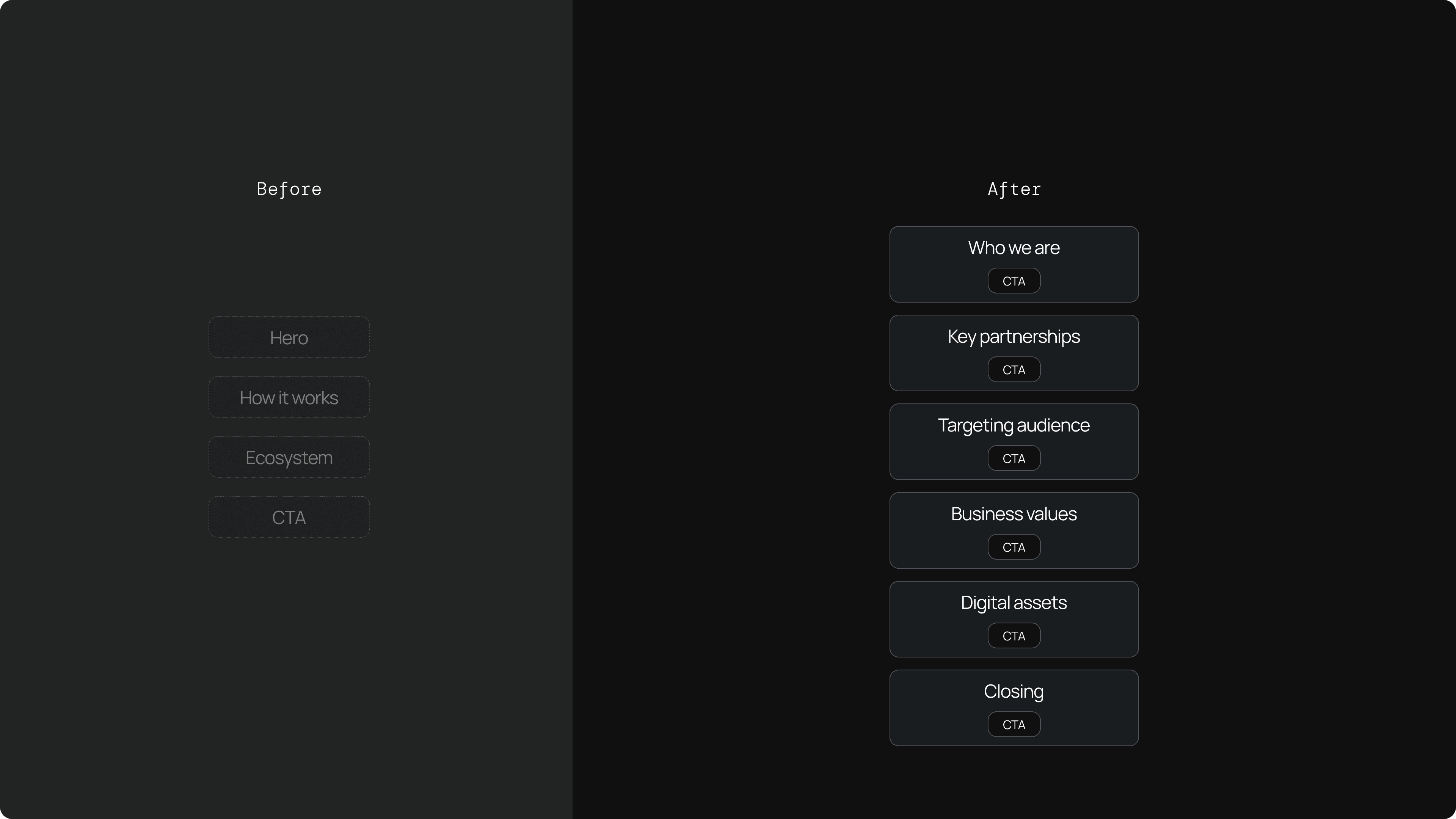 The old page had a pretty basic flow — a hero, a short ‘how it works’ section, an ecosystem piece, and a single CTA at the bottom. It didn’t tell a strong story, and the bounce rate at the hero was high.